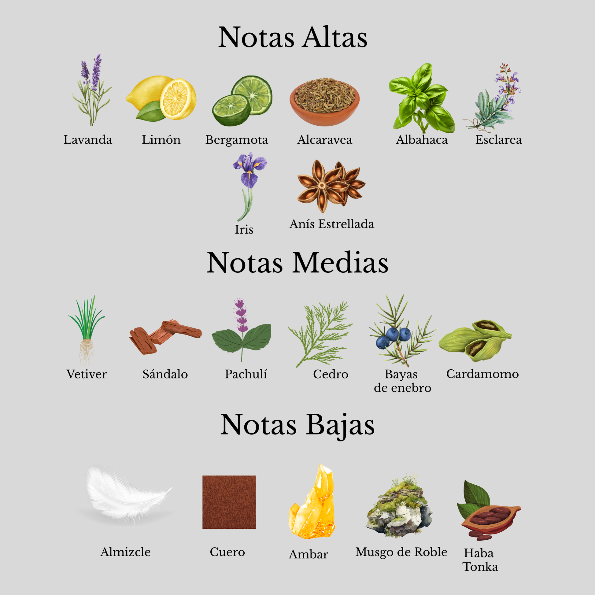 - Medias: Vetiver, sándalo, pachulí, cedro, bayas de enebro y cardamomo