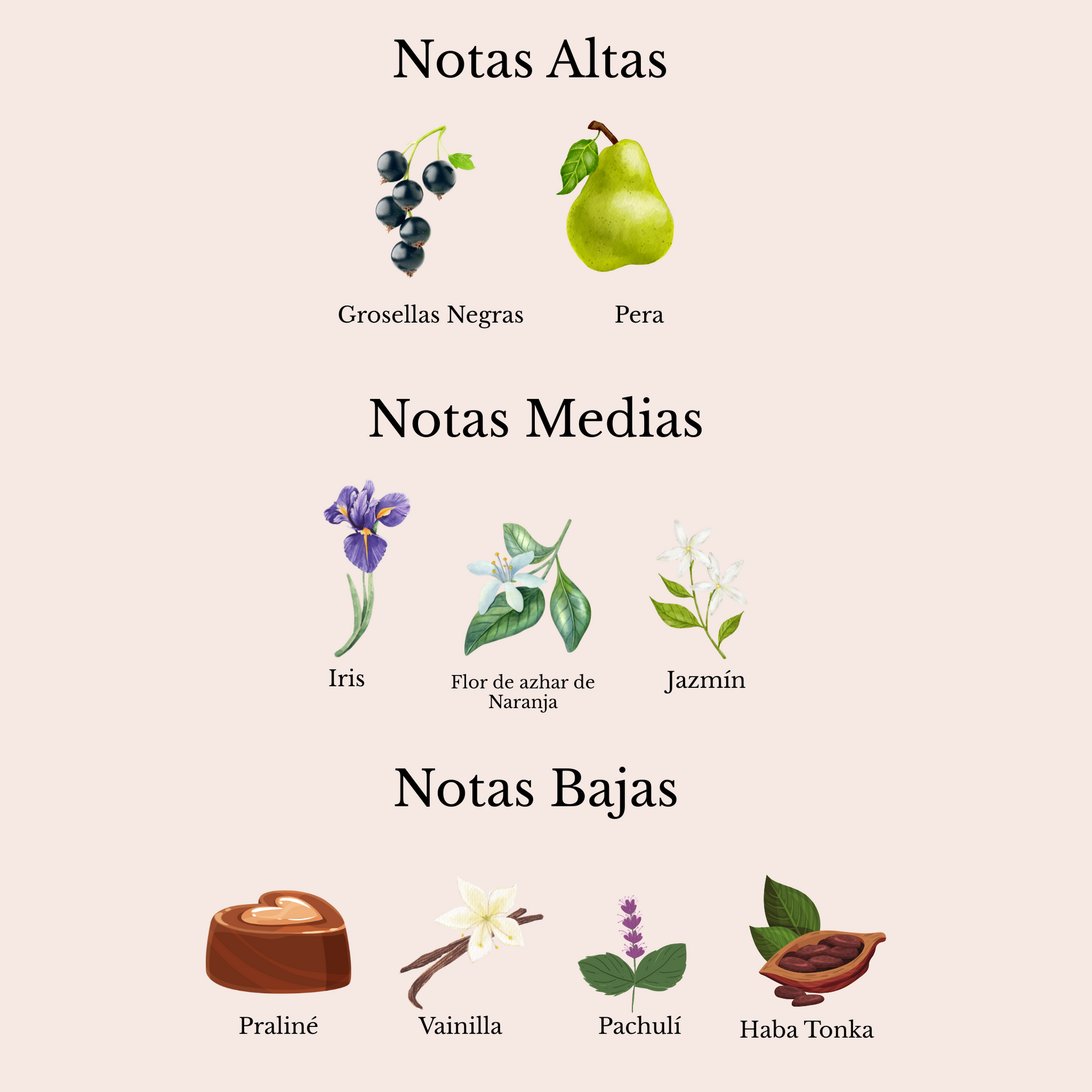 - Bajas: Vainilla, praliné, pachulí, haba tonka